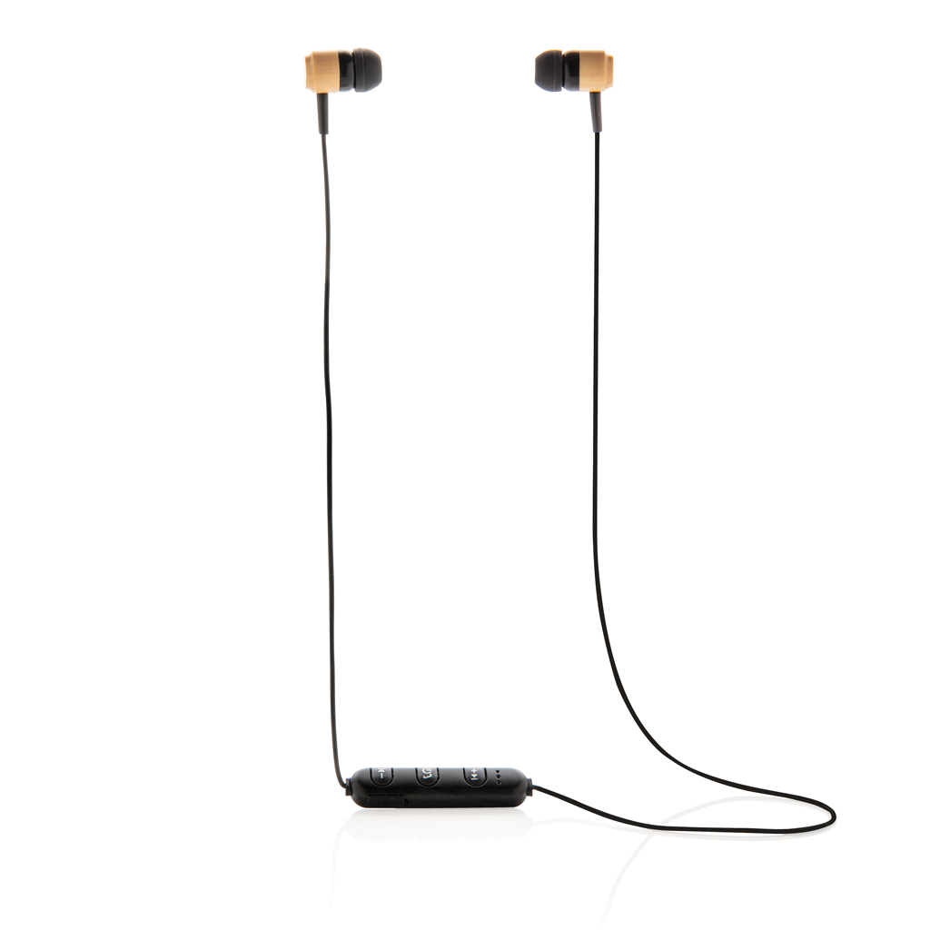 Ecouteurs sans fil en bambou livré dans une pochette ECO. Ils sont équipés d'un aimant pour les accrocher ensemble et éviter de les perdre lorsqu'ils ne sont pas utilisées. Batterie de 55 mAh pour une autonomie de 3 heures et chargement en 1 heure. BT 5.0 pour connexion rapide jusqu'à 10 mètres. Avec microphone. 3 tailles d'embouts inclus.