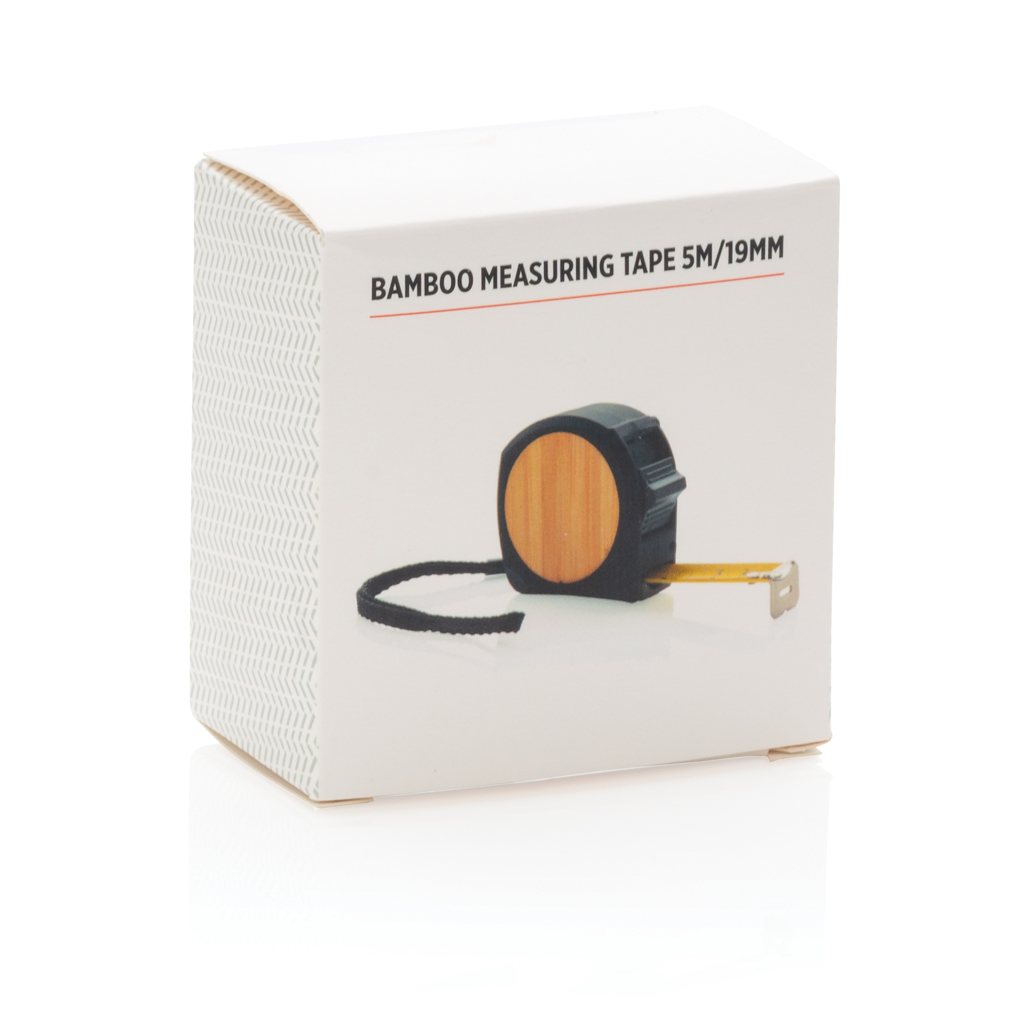 Mètre ruban 5 m/19 mm en ABS finition gomme et bambou. Avec clip ceinture et dragonne.